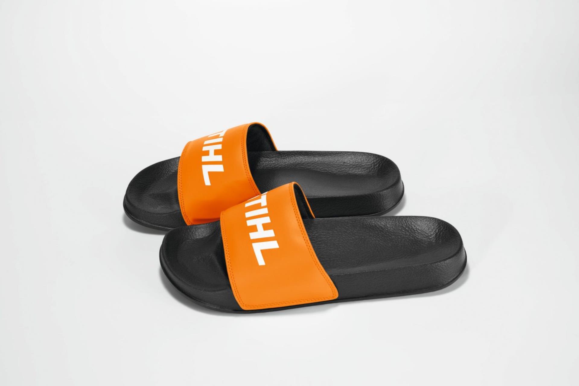 STIHL Badelatschen in Schwarz und Orange, Netzschuhbeutel inklusive.