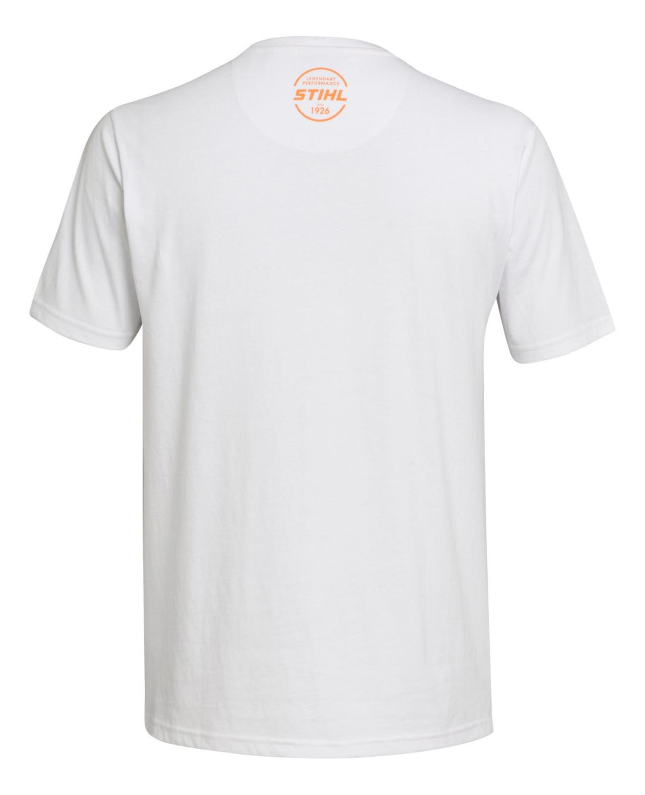 Weißes Rundhalsshirt aus hochwertigem Baumwoll-Jersey mit großflächigem Logo-Druck in kontrastreichem Orange. Innen STIHL Logo-Label, hinten außen weiteres Logo in Orange.